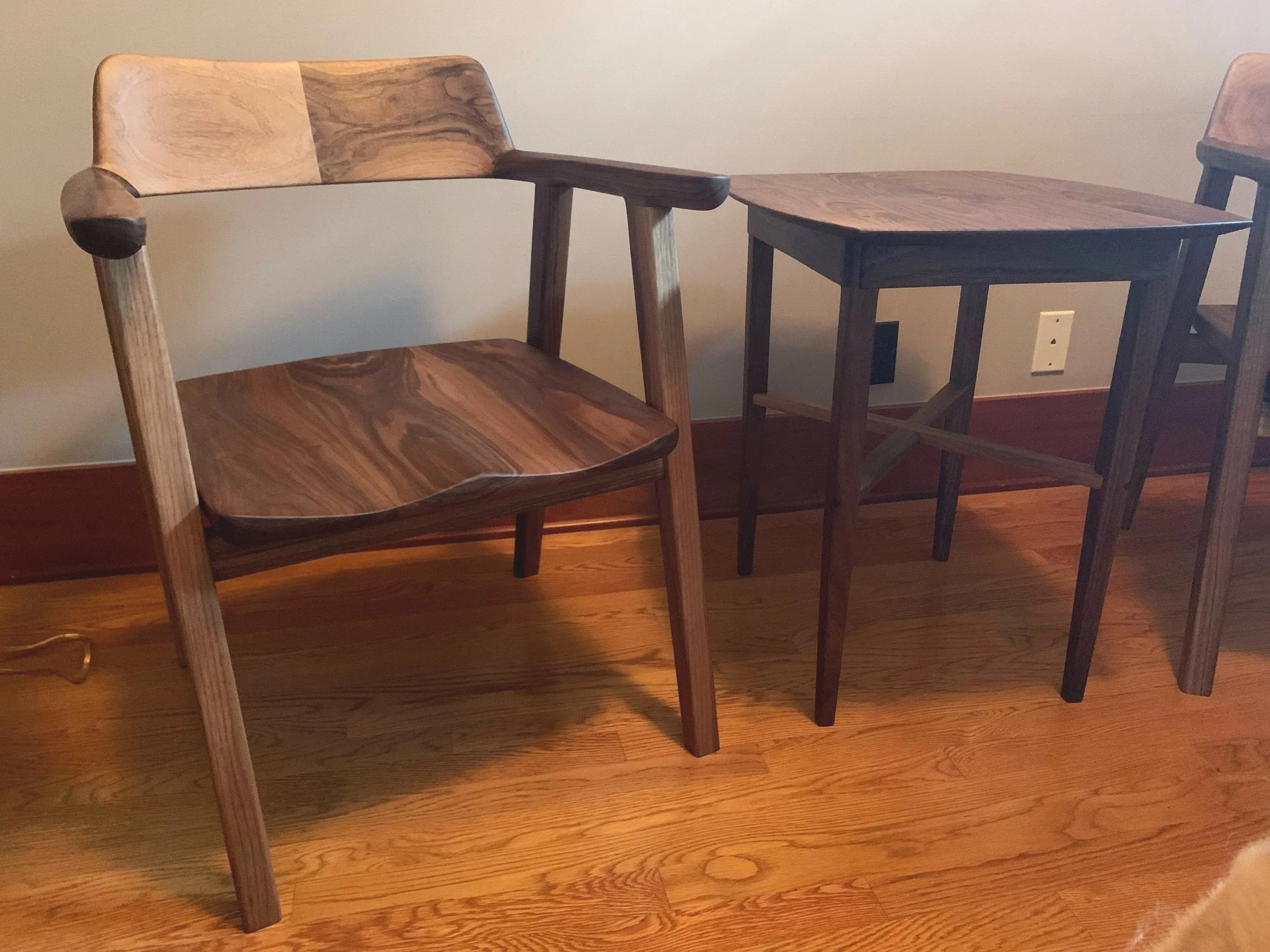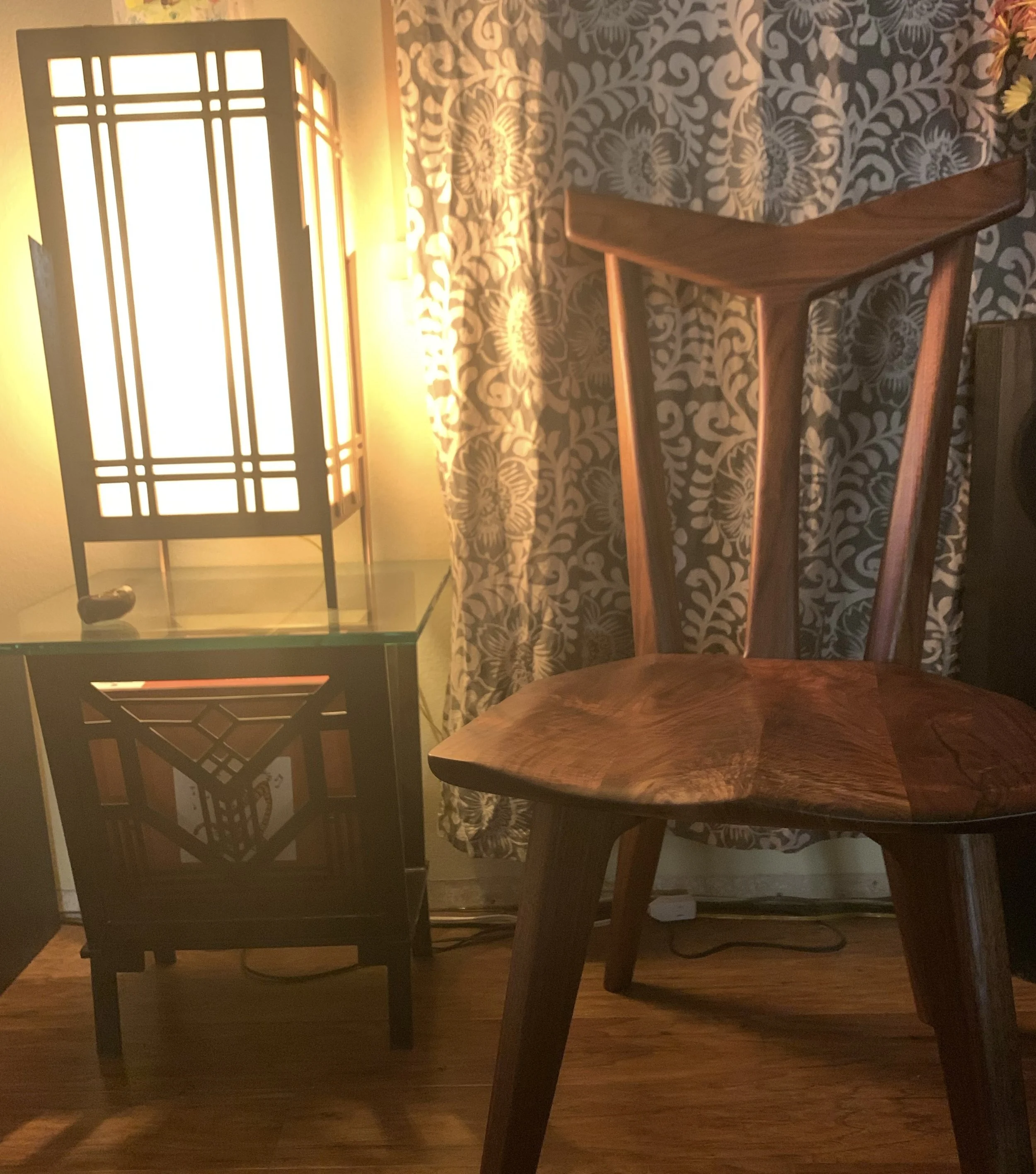Invite hardwood chair, Wright metal and glass rack/table, Glow hardwood lamp